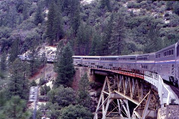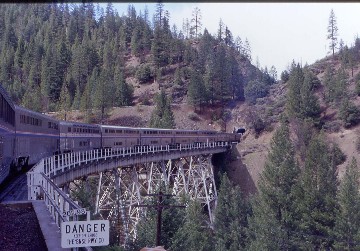 The Western Pacific was completed in 1909 as a 927 mile railroad with a grade of only one percent all the way from Oakland to Salt Lake City. The Golden Spike was driven right here on the Keddie trestle back in those days. The most famous of all passenger trains to run over the railroad was the California Zephyr, which ran until March 23, 1970, a year before Amtrak was born. The Western Pacific was one of my favourite railroads and it was a sad day when it became part of the Union Pacific.