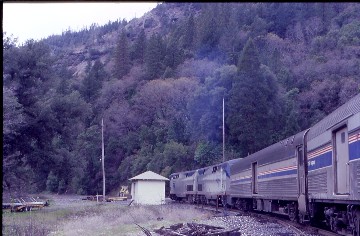 We made our way to the Rock Creek trestle, ran by the empty siding of Merlin and across the canyon, the rock face was very impressive as we neared the Elephant Buttes. At Pulga, we met BNSF 4677 East on the main while we pulled into the siding at 2:50 PM to relieve our Amtrak crew, who were about to die on the hours-of-service law.