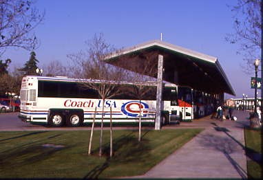 The bus of Necessity to Sacramento 3/21/2003We departed at 6:13 PM and proceeded north on California Highway 99 as the sun was setting. It was really a fast journey since I had my music with me and I chose The Rolling Stones' "Bridges to Babylon" followed by the Tubes' "Live" which took me most of the way to Sacramento. I gave the bus driver directions and we arrived at 10:20 PM, thirty-five minutes before the train would have arrived. If you take the fact we left twenty-three minutes after the train should have left, our non-stop bus trip was almost an hour faster than the train. Yet I will always prefer the train, no matter what. The waiting room was full of passengers waiting for the last train of the night.