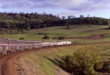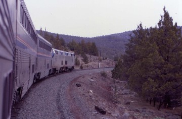 3/24/2003 I awoke briefly at San Luis Obispo at 5:15 AM {3:20 PM} and was up for good just after the Coast Starlight passed through Grover Beach. Sunrise came after Guadalupe and the climb though Casmalia was beautiful in the early morning light. Crossing Vandenberg Air Force Base, the deer were out in force, something I had never seen in all my trips across the base. There was no dining car service this morning (why?), so it was another lounge car breakfast. I pointed out the coastal sites to a family from Oregon and we saw pods of whales spouting, another first-time experience. The clear skies turned into low clouds as we cruised east along the Santa Barbara Channel and we passed the state parks and went to Santa Barbara, a mini-fresh air stop. On the move again, I just sat back, listened to the Scorpions' "Live" and let the Starlight take me south.