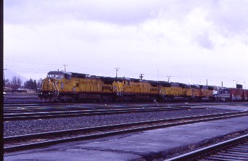 Coast Starlight 11 3/22/2003 The Highline/Inside Gateway Detour3/23/2003 My day of my sobriety switched from day 2,985 to 2,986 at midnight as we continued to sit then at 1:05 AM, we reversed eight-tenths-of-a-mile to clear a switch to put us on the track next to the station so we pulled back into the station. Graham stayed up while I managed about three hours of sleep and I woke up with him giving me the thumbs-up that we were being detoured. Our BNSF pilot engineer arrived at 4:13 AM and we highballed Klamath Falls at 4:32 AM {10:00 PM}, pulling down to the south end of the yard where we waited for a signal and a BNSF freight pulling down next to us. At Bieber Line Junction, we finally curved off the Union Pacific's concrete ties for the wooden ties of the BNSF Gateway Subdivision and my new mileage began.