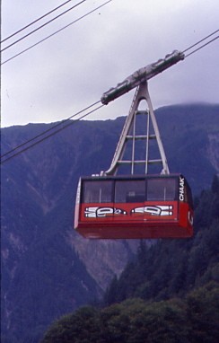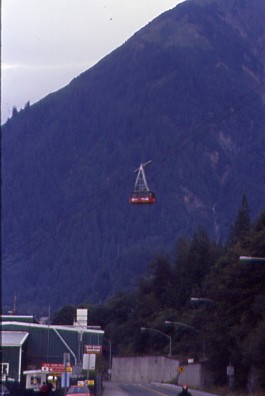 The Goldbelt Tram uses a cable transportation system known as an aerial tramway, first used in the European Alps in the late 1800's and has two 60-passenger cabins, capable of a maximum uphill capacity of 1,050 people per hour. Maximum speed is 2,000 feet/minute or 23 mph. This type of tram is known as a double-reversible or "jig-back". Both cabins are coupled to a common haul rope and they move in unison, one up and one down.