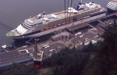 Goldbelt Mount Roberts TramwayThe experience begins with a five-minute ride from the cruise ship pier to the 1,800-foot level of Mount Roberts as the Chilkat Mountains, the Gastineau Channel, downtown Juneau, Douglas Island and the highest peaks on Admiralty Island spread out before you. At the top, explore the Sky Bridge and Mountain House complex created by Goldbelt Incorporated, the local Native Corporation that owns and operates this attraction. Visit the live bald eagle display, do some alpine hiking and walk the trails. The interpretive signs, wildlife-viewing platforms, birds, wildflowers and traditional Native tree carvings provide an enhanced mountain top experience.