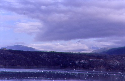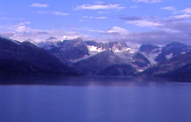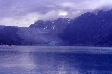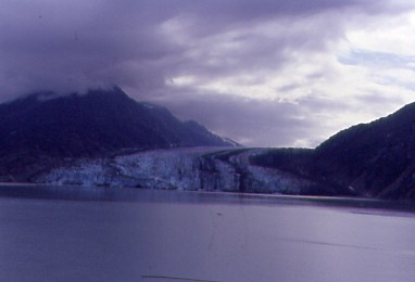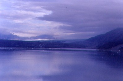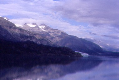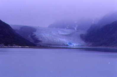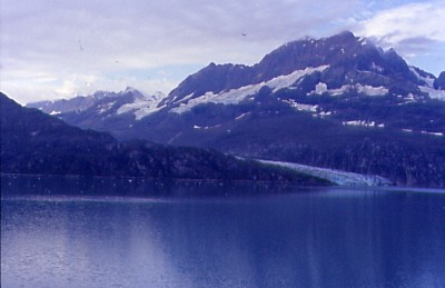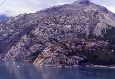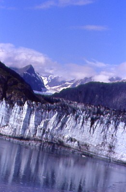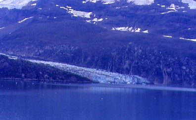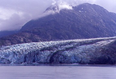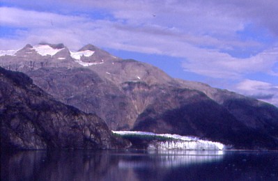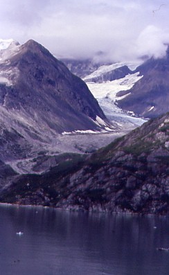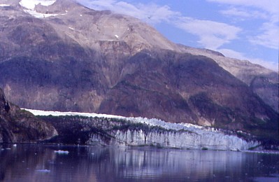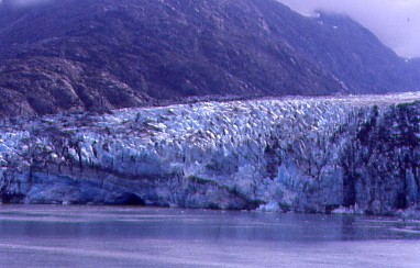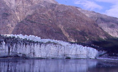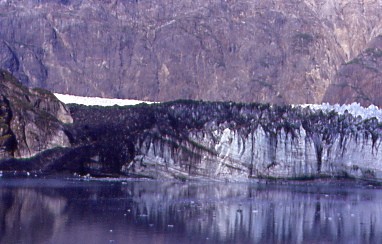 The first tidal glacier we saw was Reid Glacier, which is about three-quarters-of-a-mile wide, 150 feet high and over ten miles long. Like Lamplugh Glacier to the northwest, it originates in the Brady Icefield. The glacier is now fully grounded. Sediment deposited from streams draining out of the glacier on the eastern and western margins is gradually filling the inlet in front of the glacier, the deposits being exposed at low tides. The center of the glacier continues to slowly recede at about 30 to 50 feet per year, while the remainder of the margin has been receding at about 30 feet per year or less while progressively thinning. Crevasses that characterized Reid Glacier within its terminus region since the early 1900's are slowly closing as flow rates decrease and the terminus becomes terrestrial. The glacier filled all of Reid Inlet in 1899 and has slowly receded to its current position since that time. On the walls of the fjord, lateral deposits of the glacier extend from near the waterline up and along the bedrock face, and mark the positions and thickness of the ice at locations where it remained stable for some period of time during this overall period of recession.