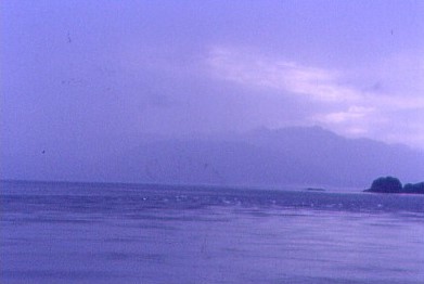 We came to the point where John Hopkins Inlet turned southwest, giving everyone a beautiful view of John Hopkins Glacier. This tidewater glacier is about one mile wide and 225-300 feet high at the terminus. It is formed from numerous tributary glaciers, many of which extend twelve or more miles into the surrounding peaks. About 50 medial moraines develop from the joining of these tributary glaciers. The debris in these moraines can be seen in the ice face and extending up-glacier as prominent black bands. This debris is transported in and on the ice and released either by melting of the ice face or calving of icebergs into Johns Hopkins Inlet. Of note, Johns Hopkins is characterized by submarine calving - calving below the water surface caused by breaking off of ice from an "ice foot" that extends from the basal part of the glacier. These "basal bergs" rise suddenly and unexpectedly, emerging, sometimes explosively, without warning at the water surface. Melt-water from the glacier is discharged from submarine tunnels or conduits located near both the eastern and western edges of the glacier. Sometimes this water emerges at the inlet surface as fountains. Black-legged kittiwakes are commonly seen diving, floating and feeding where the meltwater upwells along the ice face.