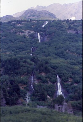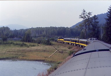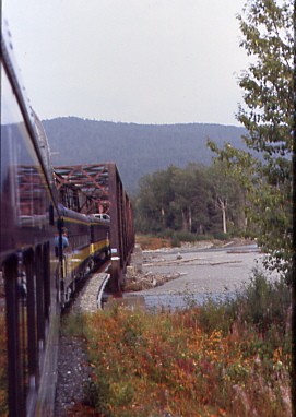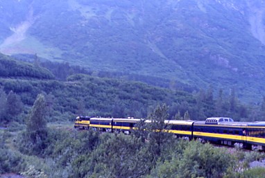 I went to the dining car for a wonderful pot roast dinner and we passed a waiting freight train. I then rode in the front seat of the rear dome car all the way back beyond Spencer Glacier. The clouds had lifted as we rolled through the beautiful Alaska scenery, but I was low on film by this point (those whales did me in!) Where else can you ride a dome car in daily service on a mainline during the summer in the United States?