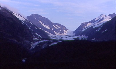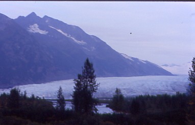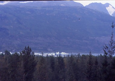 The overlook for Trail Glacier at MP 44.3. The rock and dirt in the middle of the glacier is a medial moraine. Trail Glacier got its name because a trail was built upon its face, since it was easier to walk the glacier than fight the brush, river and rugged terrain down in the valley.
