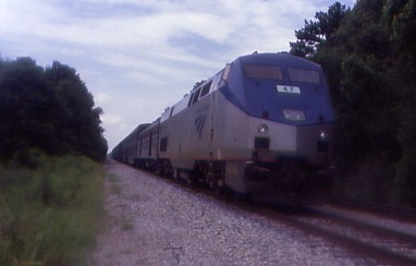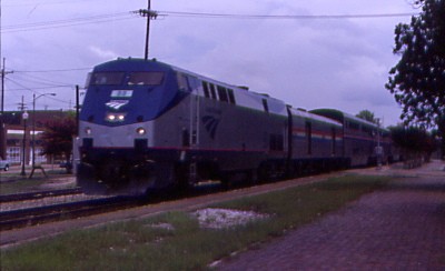 6/23/2004 I awoke about twenty minutes before Memphis with views of the Mississippi River and a new streetcar line as we came into town and once there, I detrained for a picture of our train. Due to a freight train crossing in front of us, our departure was delayed. I enjoyed a French Toast and sausage breakfast with the same couple from the Bay Area whom I dined with last night. We entered the State of Mississippi as the City of New Orleans rolled south on this rainy morning. At Greenwood, the smokers took a soggy break while I enjoyed the fresh air from the door of the sleeping car. If I was still drinking and was offered free drinks in the pouring rain, I would have been the first one off the train but I have not done any drinking in 3,444 days and have no plans to ever start again. We departed Greenwood an hour and seven minutes late.