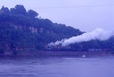 South of Weaver, we caught the train running along the river again. Then the rains came; at first a light shower which we ran through for miles until we came to the really heavy rain. We overtook the train, stopped and then it sped by in this cloudburst. Lightning and thunder echoed off the bluff. This storm was awesome.