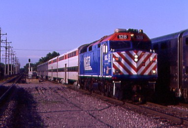 After a great continental breakfast at the Holiday Inn Express in Kenosha, Wisconsin, I walked back to the Metra station and waited for Metra 316 to come out of the overnight yard then boarded cab car 8452 for my trip back to Chicago on a beautiful clear morning; Metra trains almost always run with the locomotive pushing the train. We had cab car 8452, coaches 7243, 7256, 7797 and 7781 with F40PH 128 as our power and this train ran more or less as an express from Waukegan, skipping eleven stops which are covered by Train 318 that was following us.