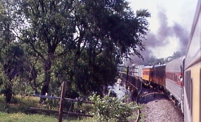 We sped through Aurora passing the former Chicago, Burlington and Quincy roundhouse and Metra station before curving through town to cross the Fox River. I rode in the vestibule off and on, wearing my safety glasses as Milwaukee Road 261 is a coal-burning steam engine as it steamed across the Illinois countryside, crossing Big Creek and flying through Plano at track speed. Little Rock Creek was next, followed by passing through the town of Sandwich. Somonauk Creek was crossed just before the town of the same name and US 34 joined our route, so watching the chasers was fun. Little Indian Creek was crossed before Leland and later Indian Creek before we reached Earlville with the former Chicago and North Western (now Union Pacific) crossing then we traversed across Sutphens Run before Meriden and ducking under Interstate 35.