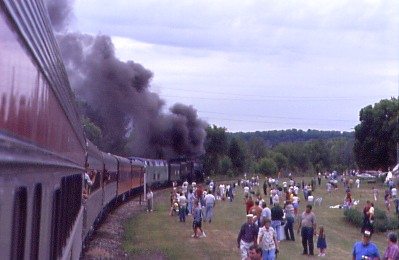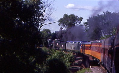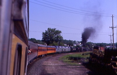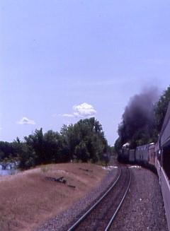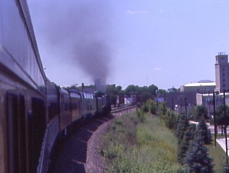 Milwaukee Road 261 departed Chicago Union Station at 11:03 AM to officially start the Grand Excursion of 2004 and we made a smokey exit as we turned west onto the BNSF, climbing the short grade then rolled down the triple track mainline Aurora Speedway before crossing the Des Plaines River. We stopped at LaGrange station and Stone Avenue stations to board passengers, then later at Route 59, several more rare mileage passengers boarded, whom I knew.