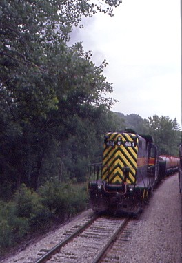 We passed Iowa Interstate GP10 484, ex. Iowa Interstate 8084, exx. Illinois Central Gulf 8084, nee Illinois Central GP9 9084, built by Electro-Motive Division in 1955, on a local before going down the siding with a tight curve to the Peoria line, which we pulled down.
