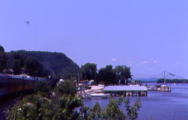 We crossed the Union Pacific mainline right as it crosses the Mississippi River into Illinois. A few minutes later, across the river, was the town of Fulton then we passed Lock and Dam 13, Deer Creek siding and went under Eagle Point then through Burgess Hollow. The Mississippi River is at its largest width along here. We trestled over Silver Creek and ran into Pomme de Terre Prairie then crossed Elk River and under Bald Point then passed through Cooks, Mound, Dixie and Hubbel Islands, all in the Mississippi River before going under Waneta Point.