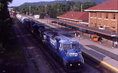 We returned to the bridge that overlooks the station, first catching a train with former Conrail, CSX and Canadian Pacific Railway locomotives switching.