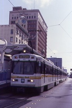 Once that train arrived, all the commuters detrained then we boarded and chose a pair of seats on the right. The operator was changed out and once our new operator was settled in, we started to Long Beach down a long tunnel to daylight. Upon exiting the tunnel, the Staples Center and Los Angeles Convention Center were passed before we arrived at the Pico station, then we ran a few blocks before ducking under Interstate 10 (Santa Monica Freeway) to Washington Boulevard, where we turned left onto a route down the middle of the street. In the median of Washington Boulevard was Grand and San Pedro stations. Along here to the north was the Olympic Auditorium, which was once the home of the Los Angeles Thunderbirds, that roller derby team I watched as a child.