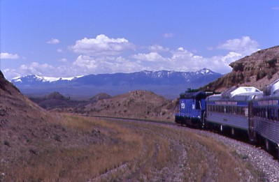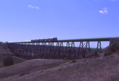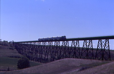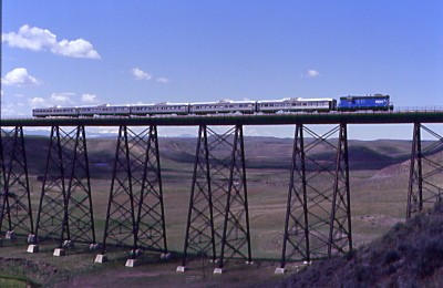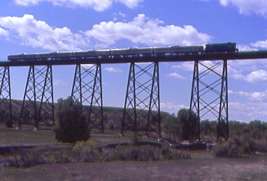 The photo runby at the Judith River Trestle, MP 75.7, which has 33 spans, is 150 feet high and has a length of 1,953 feet.
