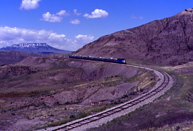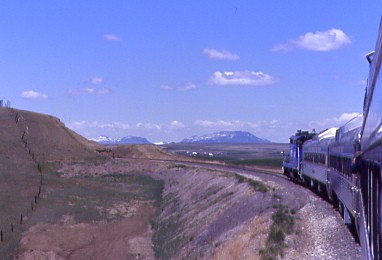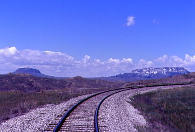 Square Butte and Round Butte came into view before we ran south of the town of Coffee Creek then crossed the creek of the same name at MP 101.6 and proceeded to the township of Arrow Creek at MP 106.4.