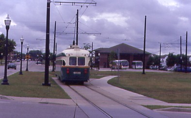 I walked out to the waiting PCC car meeting Carl, the operator of this car. Already aboard were Carol and Tom from the last rare mileage trips I was on in the Pacific Northwest. It certainly is a small world! The streetcar ran a counter-clockwise loop of 1.88 miles and we departed running along the east side of 54th Street for three blocks where we turned left onto 11th Avenue in front of the Metra station. At 56th Street, we turned left and ran down a grassy median lined with trees, passing the County building, court house, Civic Center building and post office before stopping at red signals and pausing at stop signs.
