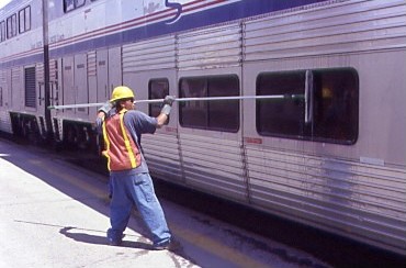 As part of the servicing of the train, here the windows being washed by hand; one of the few places on the entire Amtrak system where this is done. I picked up a USA Today and was reading it as the Southwest Chief departed on time.