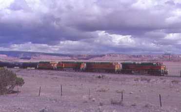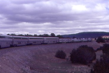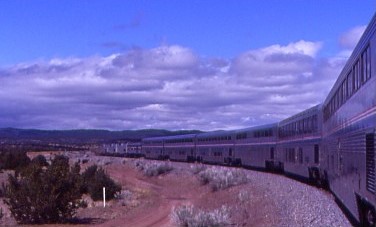 4/26/2004 I awoke to the pine trees just west of Flagstaff on a mostly cloudy morning and saw the Art Train USA on display east of the Flagstaff station. A breakfast of French Toast and sausage was taken with a couple who had just ridden the Grand Canyon Railway and were now on their way to Albuquerque. I returned to my seat and found that the person now sitting next to me was also going to La Junta on a Rail Sale ticket. His name was Eric, a young railfan from Flagstaff who just happened to read my website. Is it a small world? Was this planned? No, but what were the chances that on a full train, two railfans would be going to the same place and seated together? We talked all the way to Gallup.