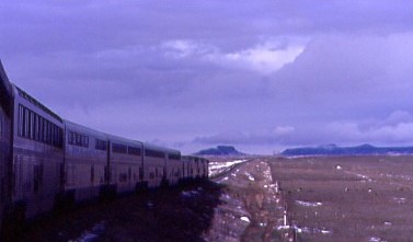 I worked on my suntan on this warm afternoon for forty-five minutes before returning to my seat for Ozzy Osbourne's "Speak of the Devil". I saw the Assistant Conductor and asked about upgrading to a room and told him about my reaching 800,000 rail miles tomorrow, to which he responded that hee would get back to me before Gallup if he had a room. We departed on time and made our way to Gallup, going to Dalies and west of the line separation, Eric and I went to dinner. From Menu Five, I enjoyed a New York strip steak along with my usual sundae. Joining us was Peter, who was returning from Cleveland to his home in Los Angeles. The meal lasted through Grants and out to Pegs, where I returned to my coach seat to listen to more music. Before Gallup, the Assistant Conductor came and told me he had a room for me for $70 and would be by after Gallup to settle with me.