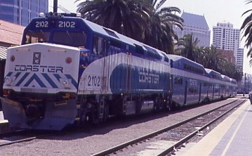 A Coaster train, led by F40PH-3C 2102, built by Motive Power Industries in 1994, at the San Diego station.