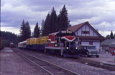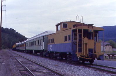 Passenger service on the Metaline Falls Branch was once fairly heavy. During the 1920's, at least two passenger trains a day ran in each direction - one a daily mixed train between Newport and Metaline Falls and another being a daily through passenger train between Spokane and Metaline Falls. The mixed train would take five-and-a-half hours to make the run from Newport to Metaline Falls (averaging just over eleven miles an hour) while passenger train 218-117 would take two hours and thirty-three minutes (averaging twenty-four miles an hour). This indicates that quite a bit of local freight was handled by Train 293. Since our excursion train will take about four hours to make the run and also consist of both passenger cars and open cars made from former freight cars, we will follow the lines using mixed train 293. By the way, passenger service ended on the line by the end of World War II.