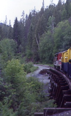 Climbing towards Metaline Falls. We crossed Pocahontas Creek at MP 102.9 followed by six more timber trestles in the next two miles before arriving at the yard at Metaline Falls.