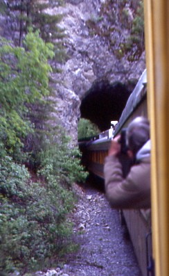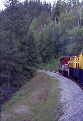 Calispell Mountain has a ski area on the slopes and there is a rock formation to the east that we shall call the "Calispell Indian Grotto". We later crossed both Trimble Creek at MP 66.3 and Tacoma Creek at MP 66.9 prior to running through Locke at MP 68.7. The creek crossings continued with our train running over both Cusick Creek at MP 70.3 and Parker Creek at MP 71.9 before reaching Jared at MP 72.6, with its 13-car siding. As we continued north, the train bridged Gardiner Creek at MP 72.9 before we arrived at Ruby, MP 77.6. The excursion then bridged Reynolds Creek at MP 77.9 and Ruby Creek at MP 81.4 before the valley narrowed into a canyon. At MP 81.5, we passed Blueslide siding, a seven-car affair before plunging into the 1,100 foot Blueslide Tunnel in total darkness at MP 82.0.