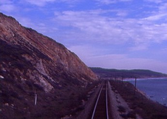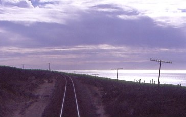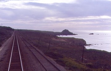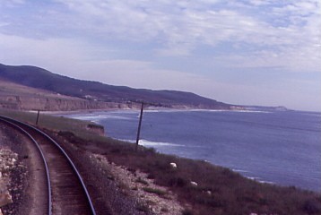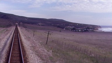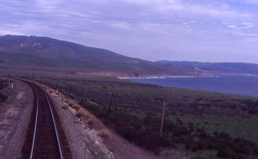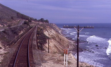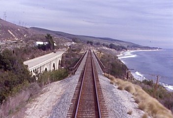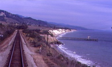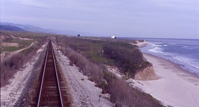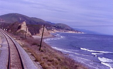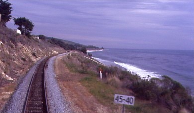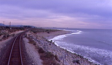 The Coast Starlight meets the Pacific Ocean north of Ventura.