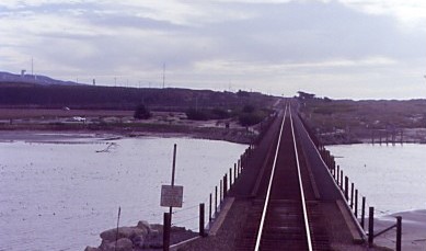 With the train's slow progress, I was finally able to photograph Granite Rock Company MP15 2000, ex. Union Pacific SW10 1255, nee Union Pacific SW7 1813 built by Electro-Motive Division in 1950. At Aromas, we passed a complete tie replacement gang and returned to track speed before Watsonville until we crept by the nature reserve at low tide at Moss Landing. We stopped at Castroville for more block authority prior to running to Salinas, a fresh air stop, from which we departed at 2:12 PM {11:48 AM}. Further down the Salinas Valley as we came into San Ardo, someone asked me what town it was. I saw a sign that said "Hell" because a tree was blocking the "S" in Shell sign. It was Shell, not Hell. That started the jokes about this town as Hell with half acre over there, the handbag there, the fire there and the trees over there. We laughed all the way to Paso Robles where my "family" detrained and we departed at 4:26 PM {1:33 PM}.