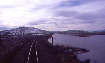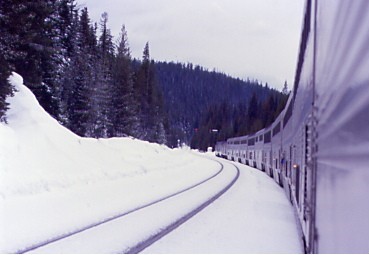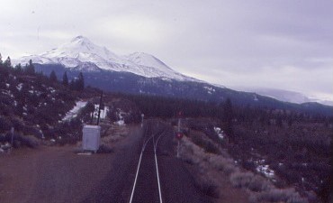 2/14/2004I awoke on Valentine's Day in the Sacramento River Canyon below Conant and walked to the lounge car for orange juice and a good cookie, a rather large chocolate chip one. The snowy Castle Crags were beautiful in the pre-dawn light but their summits were covered in clouds. We made our stop at Dunsmuir and left at 7:11 AM {5:04 AM} and the Coast Starlight climbed the Cantara Loop to Mount Shasta. Once around the corner from Black Butte, the clouds were left behind.