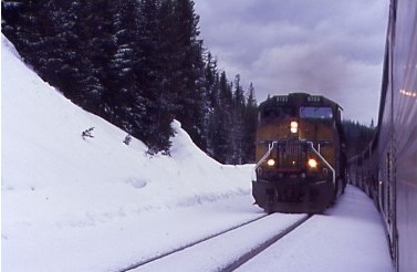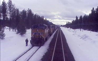 I was drinking a mug root beer as the Starlight passed a partially-frozen Root Beer Falls. My acquaintance Jim Doty stopped by for a visit discussing his employment with both the Milwaukee Road and Rock Island. He saw the Union Pacific 3985 Challenger steam train go through Albert Lea, Minnesota when I was riding it down the former Rock Island spine line. We reached Chemult and departed there at 11:31 AM {9:40 AM} then passed a northbound freight on our way out of town.
