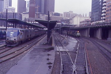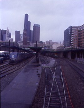 Seattle 2/15/04Waking up refreshed and ready to roll once more, I checked the Weather Channel to learn about the morning's wet conditions then enjoyed a continental breakfast then dealt with my e-mail. In a light February rain, I walked back to King Street Station to wait for my train back to Los Angeles and my next Amtrak adventure to begin while enjoying the heavy BNSF freight action outside the station.