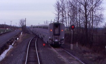 We met another Union Pacific freight at Springfield, delaying us further while the passengers in my car were really enjoying each other's company. We arrived at Eugene at 3:10 PM and departed there at 3:20 PM {12:40 PM} in a light rain and proceeded up the Willamette Valley in heavier showers to Albany, departing there at 4:15 PM {1:30 PM}. We went into the siding at Millersburg for the southbound Coast Starlight before we reversed out of the siding to continue north. The rain had stopped and there was a beautiful rainbow as the train proceeded to Salem, arriving at 5:02 PM {2:03 PM} then we were stopped again, this time by a southbound Union Pacifi bare table train at Canby.