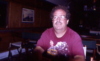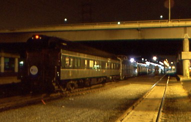 The "Los Angeles" had floodlights for nighttime viewing, so the tracks were lit, the stars shone overhead, the offshore oil platforms were all lit up and I could see the surf crashing on the rocks and beach as we headed east. It was a great experience. At Oxnard, we met a Union Pacific freight in the siding before I returned inside the train for a while. I sat at the dining table of "Los Angeles" and talked with Chris Fussell, owner of former Amtrak F40PH 231, who offered me a ride back to Santa Ana. Chris and Ryan Martin were both working as help on this trip. I worked on the story as I enjoyed the ride then when we departed Simi Valley, I was riding in the dome of "Silver Lariat" to the first western tunnel before returning to the open platform of "Los Angeles" the rest of the trip through the three tunnels and passed the depot at Chatsworth. After that, I went to "Pony Express" and talked with Stan Garner who took the above picture sitting at a table in his excellent car. We had a nice chat all the way to Glendale.
