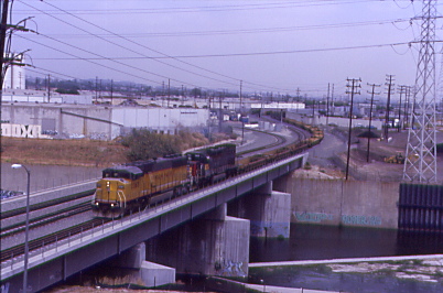 Crossing the Los Angeles River and Alameda Corridor on the Redondo flyover with a Union Pacific train about to enter the corridor below.