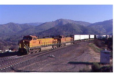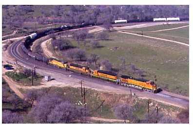 BNSF 5424 West came into Walong and met Union Pacific 4019 on the loop.