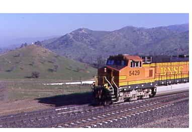 BNSF 5488 East highballing through Tehachapi with a Kansas City Southern locomotive trailing.