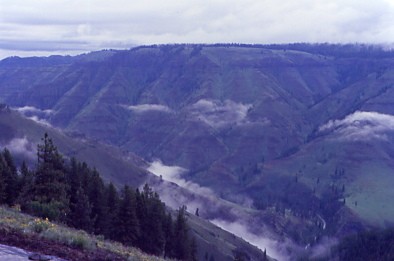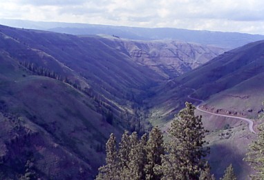 The Great Northwest Railroad, formerly Camas Prairie Railnet engine facility. As I photographed the locomotive, I watched a storm approaching from the west towards me with lightning and thunder booming across the sky then drove across the Snake River back into Washington and started climbing the grade out of the bottom of Hell Canyon. As I did that, the rain started to pour and although it lasted only ten miles, it took some of my best driving to keep going. The rest of the climb to Rattlesnake Summit at 3,956 feet, wa easy, but I next twisted and turned down to the Grande Ronde River.