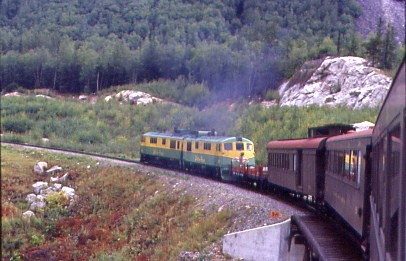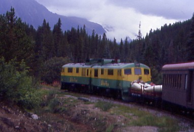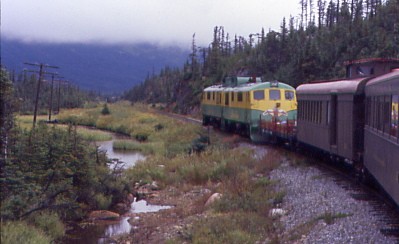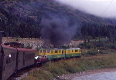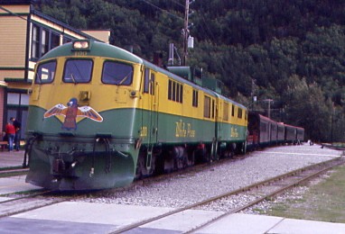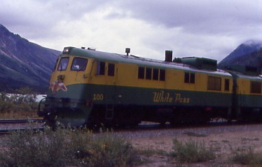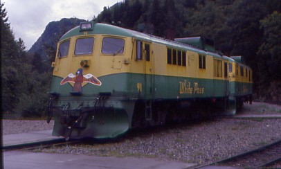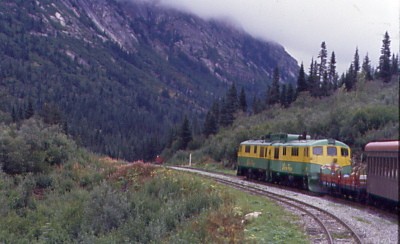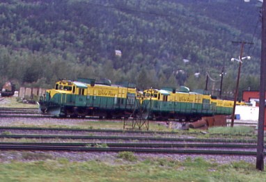 White Pass and Yukon 85 ton 100 built by General Electric in 1966, and 85 ton 92, built by General Electric in 1956. We had a two-hour layover before our passengers returned for the trip back to Skagway.