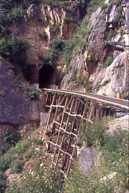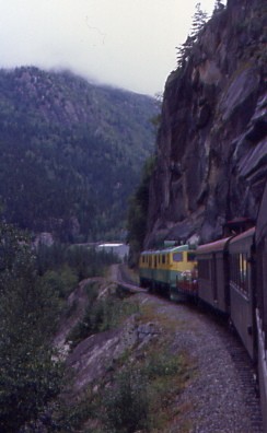 For the first 20 miles out of Skagway the costs of constructions averaged $100,000 per mile, a staggering sum for that era. The first three miles along the Skagway River were relatively easy, costing just $10,000 each, but soon the difficult section near Rocky Point (milepost 7) was encountered, driving the cost per mile up to more than $125,000. At Porcupine Point a charge of 2,500 pounds of dynamite was detonated to blast off a huge slice of the mountainside, which fell with a deafening roar into the Skagway River below, changing its course. At Tunnel Mountain (milepost 15) workers were forced to lower themselves over a cliff on stout ropes, where there was scarcely footing for an eagle, in order to drill holes in the sheer rock and set explosive charges. A 250 foot tunnel had to be drilled here on the north side of a chasm, as the railroad ascended a grade of 3.9 percent. South of the tunnel Heney’s men stood on a narrow shelf which would soon support the railroad and gazed downward to the river more than a thousand feet below. Behind them, a mile downgrade, they could see the big loop above BridalVeil Falls, where an encampment known as "White Pass City" had sprung up near the railroad. At least 35 workers were killed in construction accidents before the line was completed.