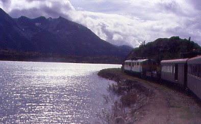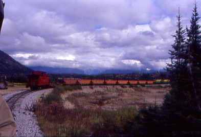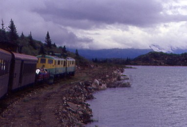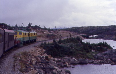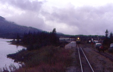 The train travelled around the balloon track here then reversed in front of the Lake Bennett station. The conductor opened the lunch room and meals were distributed from the last car of the train. I wrote most of this journey's details as I snacked.