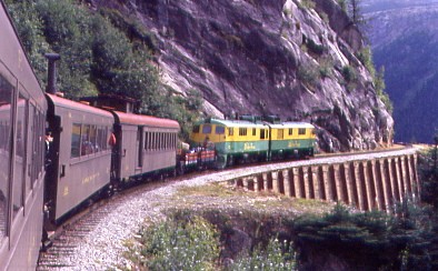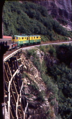 On Jul 21, 1898 the WP&Y operated its first train from Skagway to a point four miles north of town. On August 15, an inspection train puffed all the way to Porcupine Point where the locomotive drew up to the very last rail laid. The party of investors, company officials and guests rode a flatcar roped in on the sides, detraining at the end of track to peer cautiously over the edge of a stone wall atop the precipice. Skagway, which in a year’s time had boomed from a sleepy village into a raucous city of 20,000, could clearly be see in the distance. By August 25 trains were operating as far as Heney station (12.7 miles), at the confluence of the Skagway River and its White Pass Fork, as the rails continued to advance rapidly up the face of the mountain.