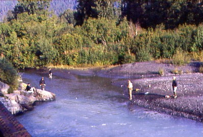 Traversing Glacier Creek with the fishermen trying their luck before we passed through Girdwood.