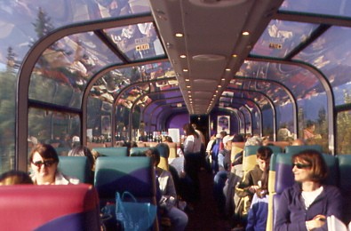 The four single level dome cars can carry 76 passengers at table seating. The seats have high backs that are alternately coloured in bright orange, yellow, purple and green hues. The dome glass rises from the table level to a point high above the aisle then repeats down the other side of the car. In the middle of the five-car trainset is the lone bi-level car that is the Tiki Railbar. Yes, it has a Tiki bar running around Alaska. This car has a complete thatched roof and faux palm trees covering the bar. There is still a dance floor and tables for enjoying beverages at one end of the car. There are a few gallery seats still on one side on the upper level above the dance floor. It was a fantastic trainset and a true blessing to be able to ride it.