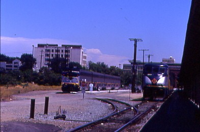 As we neared there, I saw two large puffs of smoke coming from between our sleeping car and the one ahead. We stopped and along came the conductors and a Union Pacific hi-rail truck. Smoke was coming out from under the car and began to fill our car. We learned that a head end power cable had exploded and the hot end had set the ties under the train on fire. Everyone had to exit the car so we had to sit in the lounge car then the train was reversed back into the station to attempt to solve this problem. Passengers were allowed to be on the platform and I went out to watch.