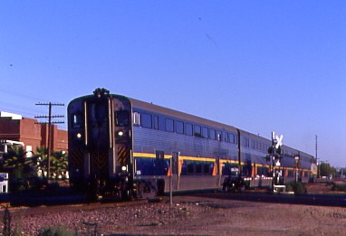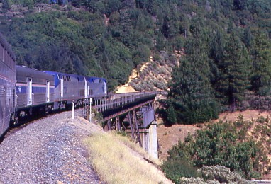 Our California Zephyr finally came into view at 1:10 PM and arrived. We boarded sleeping car 32017 Room 4 on the train whose consist was P42DC's 201 and 129, baggage 1161, sleepers 32045, 32017 and 33020, diner 38035, lounge 33022, coaches 34086, 31510 (former smoker) and 31005 (former smoker), Express 71192 and 71273, ExpressTrak 74052 and Express 71212. We departed at 1:26 PM {11:32 AM} and proceeded east towards Elvas Tower.
