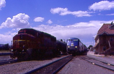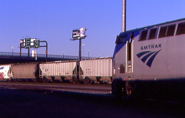 California Zephyr 6 7/22/2004Bruce told us that the California Zephyr was still in Emeryville and our sleeper was at the front of the train. At 11:18 AM, it was announced that the Zephyr was on the move and would be here at 1:00 PM. A toilet in a handicapped bedroom was the problem and the passenger had to be reaccommodated in another handicapped bedroom in another car. After a while, Carl and I went out to the platform and into more of a cooling breeze. Off a Capitol Corridor train that had been parked came Engineer Ernie, whom I had known on the Pacific Surfliners and he had just transferred to Sacramento. The small world is happening on this trip as well. Bruce came out to give us an update right after a westbound Union Pacific freight, as well as a local, passed the station.